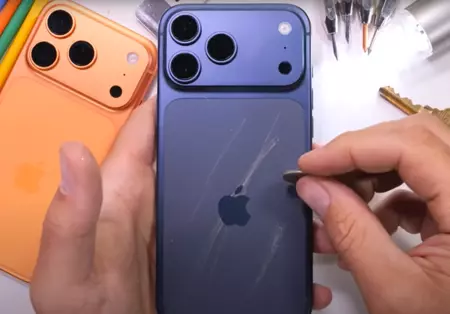 Lo vemos más claro en el vídeo de JerryRigEverything, un youtuber muy conocido por sus test de resistencia. En estas pruebas, se aprecia que, tras tratar de arañar la trasera del iPhone 17 Pro con una moneda y una llave, lo que parece un arañazo profundo se quita tras pasar el dedo. El supuesto arañazo es, en realidad, material de la capa de cristal que se está descomponiendo.