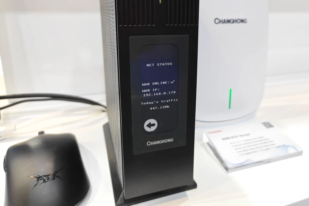 Como lo lees: han inventado un router WiFi 7 con una pantalla e-ink frontal a lo Amazon Kindle. Recuerdo haber pasado por delante del fabricante chino Changhong y no entender qué era lo que estaba viendo. Hasta que el comercial me lo explicó: el router puede mostrar su estado directamente en pantalla. Adiós a los LEDs de estado.