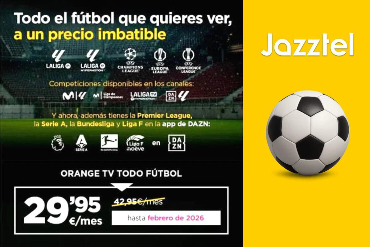 En plena temporada de ofertas privadas para conquistar a los futboleros, Jazztel ha sacado un as en la manga que hasta ahora parecía reservado únicamente a Movistar y Orange. Y lo hace con una propuesta muy difícil de ignorar: todo el fútbol por 29,95 euros al mes.