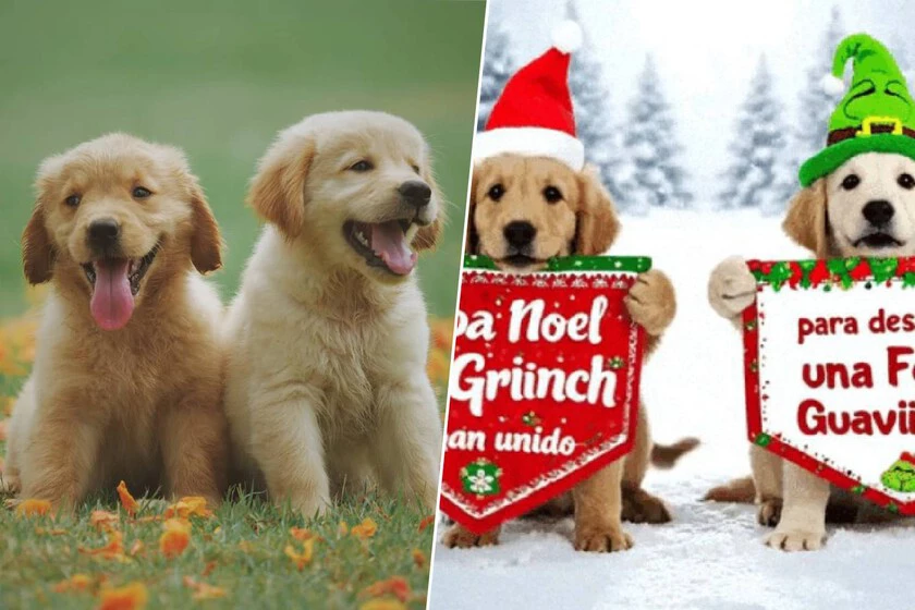 Prompt: “Convierte esta imagen en un vídeo de felicitación navideña. Coloca a uno de los perros un gorrito de Papa Noel y al otro un gorrito del Grinch. Transforma el fondo en un paisaje nevado. Quiero que los perros bailen durante unos segundos y después saquen cada uno una pancarta. En la pancarta de la izquierda se debe leer ‘Papa Noel y el Grinch se han unido" y en la de la derecha "para desearte una Feliz Guauvidad’”