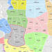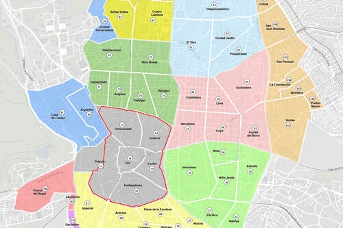 Como verás, cada distrito tiene un color diferente y dentro de él aparecen los distintos barrios con su código correspondiente. Ampliando o haciendo zoom sobre una zona o calle es posible ver la disposición de plazas de aparcamiento (zonas verdes, azules y rojas). Y donde aparezca una P, encontrarás un parquímetro para sacar el ticket.