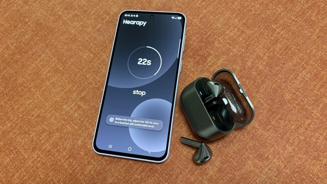 Hearapy no te pone música relajante, ni ruido blanco, ni una meditación guiada. Lo que hace es lanzarte un zumbido grave de 100 Hz que, según Samsung, estimula el sistema del equilibrio.